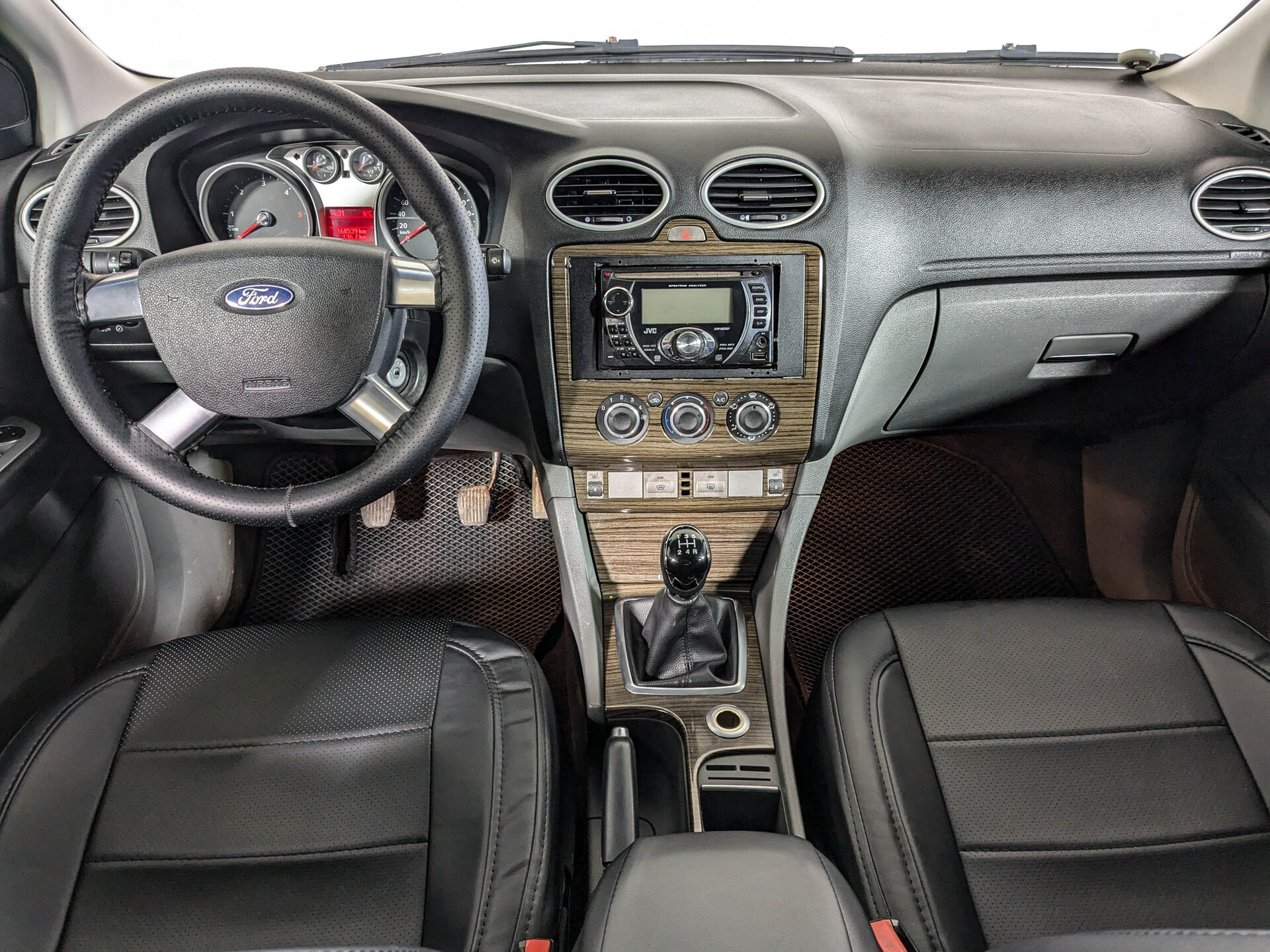 Ford Focus II Рестайлинг 2008 года — практичный седан, который подойдёт как для городских поездок, так и для путешествий за город. Чёрный кузов и тёмный салон создают сдержанный и в то же время выразительный облик автомобиля. Под капотом — надёжный дизельный двигатель объёмом 1,8 литра и мощностью 116 лошадиных сил, который отличается экономичностью и простотой в обслуживании. Механическая коробка передач позволяет лучше контролировать автомобиль в различных условиях движения.