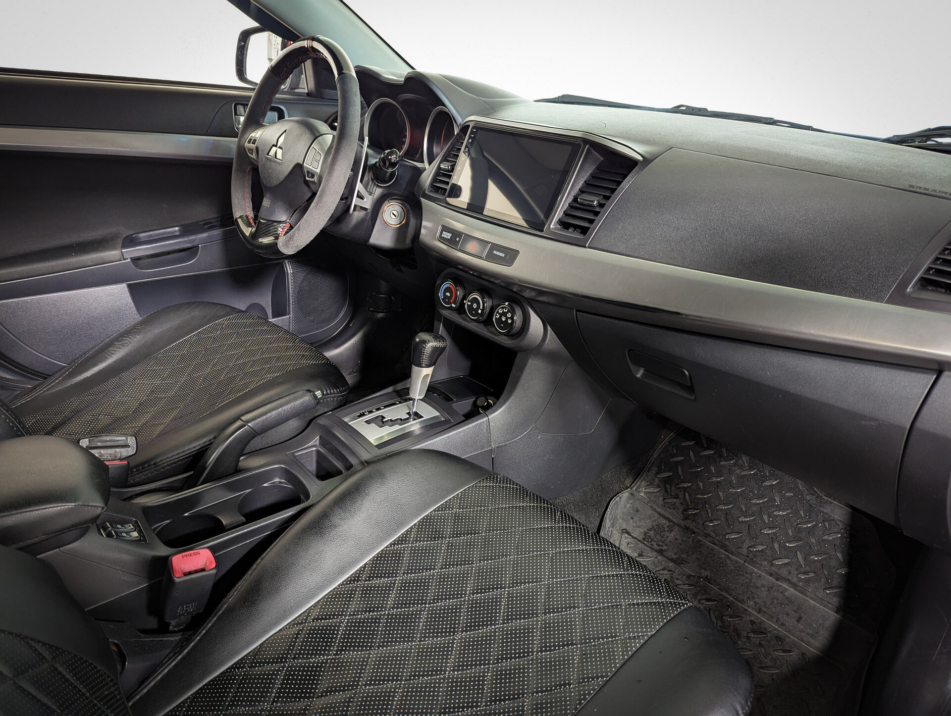 В автомобиле есть такие функции, как регулировка руля по высоте, электростеклоподъёмники на всех дверях, подогрев передних сидений и кондиционер, бортовой компьютер и аудиосистема, дистанционный запуск двигателя, тонированные стекла, защита картера, центральный замок, иммобилайзер и сигнализация с обратной связью, электрорегулировка зеркал и парктроник задний. Несколько элементов окрашено. Безопасность Mitsubishi Lancer X гарантируют антиблокировочная система тормозов (ABS), антипробуксовочная система (ASR / TCS / TRC), система курсовой стабилизации (ESP / ESC / DSC / VSA) и система помощи при торможении. Автомобиль также оснащён подушками безопасности для водителя и пассажира, противотуманными фарами.