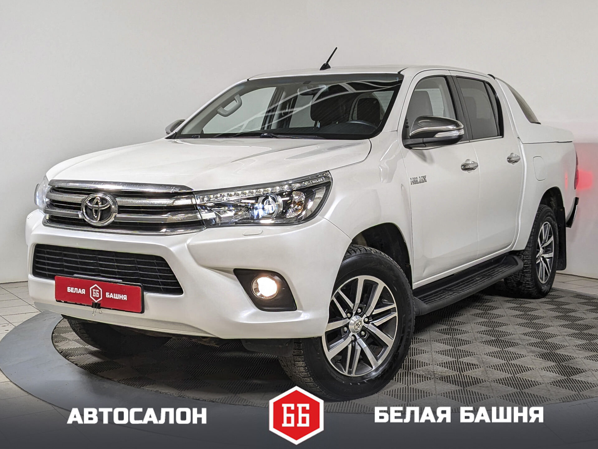 Автомобиль Toyota Hilux с пробегом 165 000 км, пикап 2016 года выпуска. Цвет кузова белый, коробка передач автомат, полный привод, левый руль. Двигатель 2.8 л. с мощностью 177 л.с.